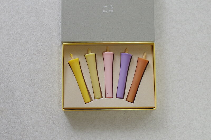 米ぬかろうそくに特徴的なのは、硬質でつるっとした肌合い、そして色ろうそくシリーズや豆ろうそくのカラーリングなど、ほどよい遊び心を含んだそのモダン性。火の力強さや美しさは、さすがにハゼ蝋燭には数歩譲りますが、蝋の垂れが少なく、芯がとても長持ちするという点、そしてお部屋にそっと溶け込むパッケージの雰囲気など、日常の中で使い心地の良さを味わえるのが米ぬかのろうそくです。