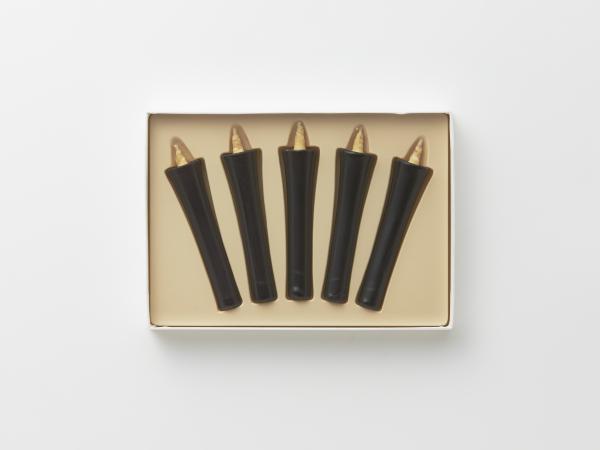 光の力強さや奥深さは櫨蝋には及びませんが、ほぼ無煙で蝋涙(ロウの垂れ)もほとんどなく、燃焼時間がより長いという優れものです。櫨よりも色つけがしやすい特性に着目して、ずらっと並べると虹色になる色ろうそく、新月の夜や宇宙をイメージした真っ黒なろうそくといった、まるで色鉛筆やクレヨンのような楽しい品々を展開しています。